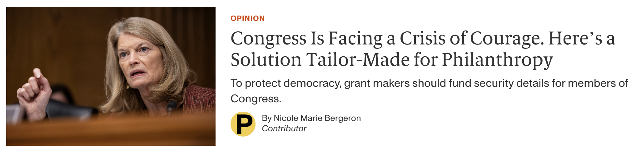 Here’s my call to action for philanthropy: If fear is shaping decisions, let’s reduce the threat behind it. Let civil society step in — not with judgment, but with infrastructure. Let’s fund safety for members of Congress, so they can do their jobs without concern for their physical wellbeing.